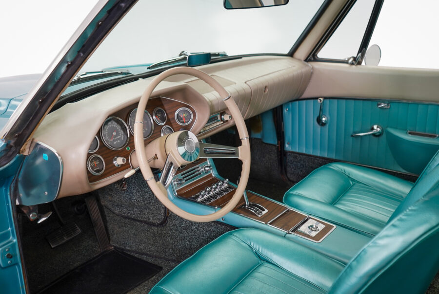 In order to achieve the car’s unique body shape, the outer panels were manufactured in fiberglass. The “bottom breather” design takes in air from beneath the front of the vehicle, eliminating the traditional front hood grill. This is a highly modern look, even today, that you’ll find on certain Porsche, Corvette and Infiniti models.
