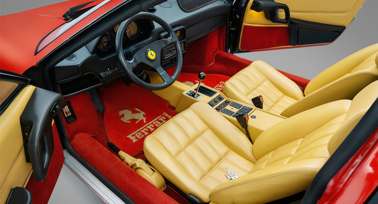 The interior trim also received a thorough overhaul, with new designs for the seat panel upholstery and stitching along with revised door panels and pulls. Cockpit switches were completely updated and modernized. The new back lit orange on black dashboard gauges were borrowed from Ferrari’s 1984 GTO supercar. The main instrument panel, seen through the anatomical Momo (Morreti-Monza) steering wheel, presented the driver with information from the large tachometer and speedometer.